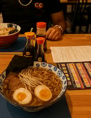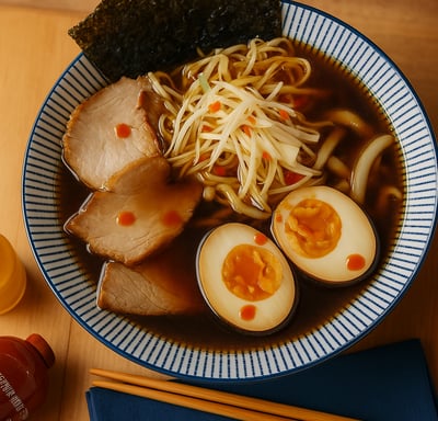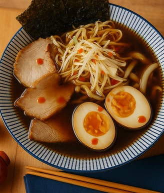 Bol généreux de nouilles fraîches dans un bouillon, garni de chashu fondant, œuf mollet, le parfait équilibre entre texture et goût.